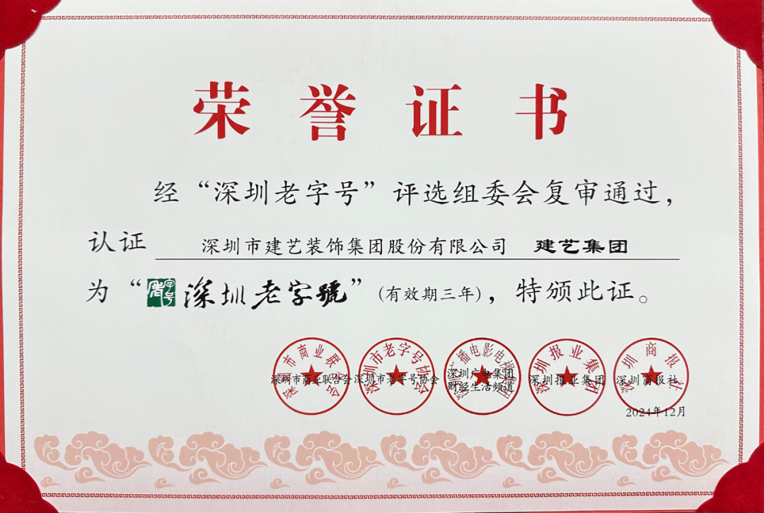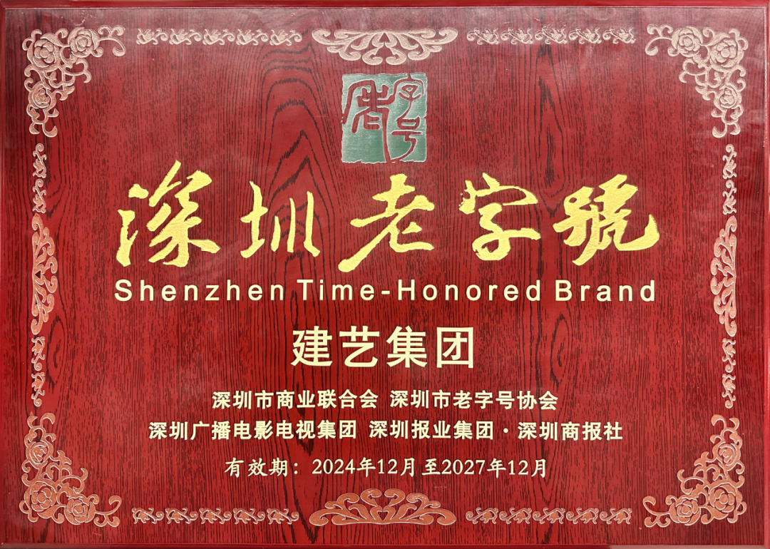 會上,共有47家老字號復審、10家新字號和20家老字號獲評授牌,建藝集團作為底蘊深厚的深圳老字號品牌之一,憑借卓越的綜合實力及品牌口碑成功通過復審,獲評第十四屆“深圳老字號”稱號。這也是集團繼續2018年、2021年以來,連續三次獲此榮譽稱號。