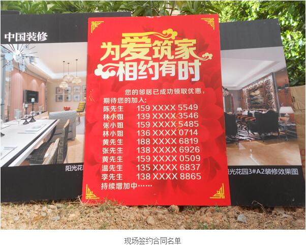 在高鐵陽光花園業主入伙活動中,廈門分公司舉辦了現場簽單優惠及抽獎等活動。自活動開展以來,已有數十戶業主在現場簽約了裝修合同。同時,廈門分公司還率先進入電子商務時代,前瞻性的注冊了互聯無線“中國裝修”網站,提供的產品服務包括:iOS平臺客戶端服務、微信公眾號服務、新浪微博服務、騰訊微博服務以及騰訊QQ客服服務等。據悉,“中國裝修”將云集國內主要裝飾裝修施工、設計企業以及各類建筑、裝飾裝修材料、家具、家用電器、生活用品等諸多生產廠商,為廣大業主提供更為周全及便利的裝修產業信息咨詢與品牌商家合作通道。