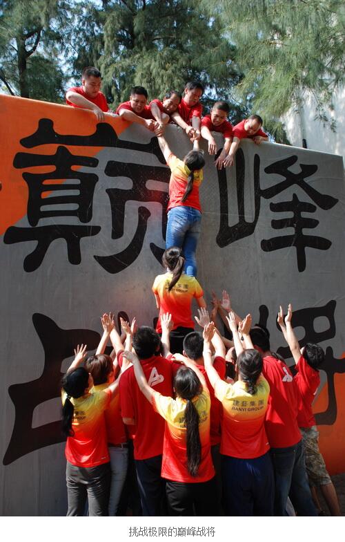 當(dāng)教練宣布完挑戰(zhàn)規(guī)則后,建藝人集體陷入沉思,在大家的心中都有這樣一個疑問:單憑“人墻”,我們能完成挑戰(zhàn)嗎?看到蔓延在團(tuán)隊中的顧慮陰霾,作為本次挑戰(zhàn)領(lǐng)隊的集團(tuán)常務(wù)副總裁田力與共同參加挑戰(zhàn)的行政管理中心總監(jiān)趙紂瑜共同制定了挑戰(zhàn)策略,并在最短時間內(nèi)將隊伍分工,確定人墻人員及攀爬人員,通過對團(tuán)隊資源的合理分配,迅速調(diào)整了團(tuán)隊成員們的心理狀態(tài)。“我們一定能成功!”的堅定信念更是將先前的顧慮陰霾一掃而光。在教練一聲令下后,第一名攀爬人員在人墻的幫助下迅速爬上墻壁,打響了這場終極挑戰(zhàn)的第一槍!