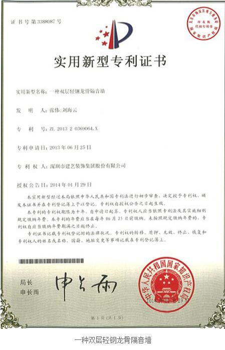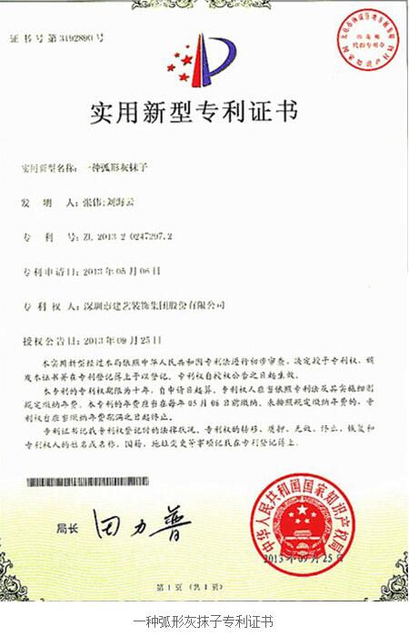 近日,建藝集團(tuán)研發(fā)的二項(xiàng)實(shí)用新型專利正式獲得國(guó)家知識(shí)產(chǎn)權(quán)局的授權(quán)。該二項(xiàng)專利為:一種弧形灰抹子(專利號(hào):ZL201320247297.2)、一種雙層輕鋼龍骨隔音墻(專利號(hào):ZL201320369064.X)。