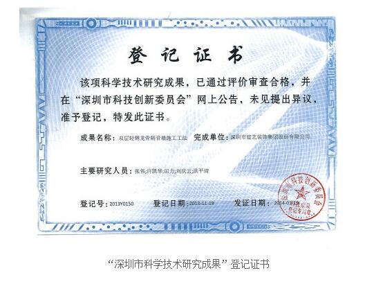 日前,建藝集團研發的“雙層輕鋼龍骨隔音墻施工工法”順利通過深圳市科技創新委員會的評價審查,獲得“深圳市科學技術研究成果”登記證書。