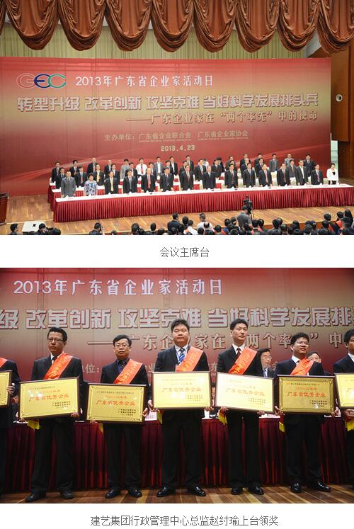 4月23日上午,由廣東省企業聯合會、企業家協會主辦的“2013年廣東省企業家活動日”在廣州白云國際會議中心舉行。中共中央政治局委員、廣東省委書記胡春華親切接見受表彰的2012年度廣東省優秀企業、優秀企業家、最佳誠信企業、創建學習型企業十佳單位代表,建藝集團行政管理中心總監趙紂瑜參加了此次會議。在表彰大會上,建藝集團分別榮獲“廣東省優秀企業”和“廣東省誠信示范企業”兩大殊榮。