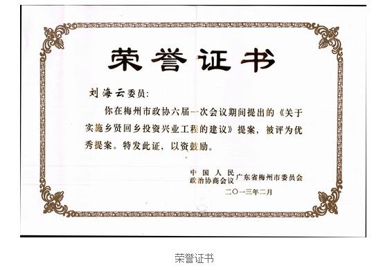 會議期間,劉海云董事長提出了《關于實施鄉賢回鄉投資興業工程的建議》提案。該提案對鄉賢回鄉投資興業工程提出了多個操作性強的意見,被中國人民政治協商會議廣東省梅州市委員會評為優秀提案。