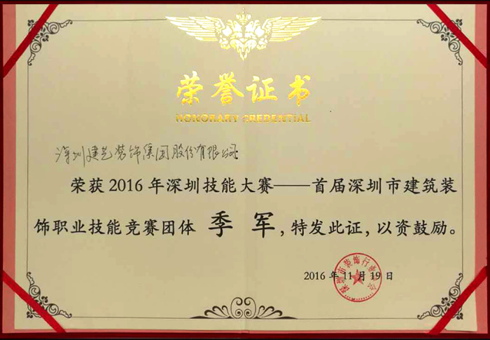 下午6點,評選結果正式出爐:建藝集團分別斬獲“2016年深圳技能大賽暨首屆深圳市建筑裝飾職業技能競賽”團體季軍和個人三等獎(鑲貼工項目)。技術精湛的建藝工匠用汗水和辛勤付出為企業贏得了榮譽,同時也用成果證明了自己的職業技術水平。
