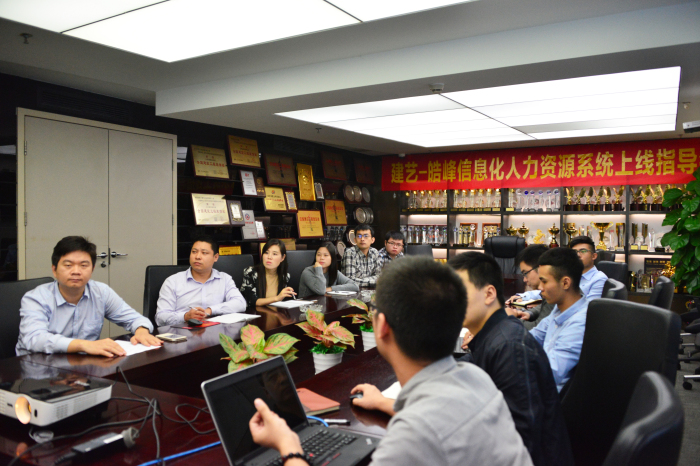 11月23日下午,建藝集團信息化系統管理項目——人力資源系統上線指導會在集團總部會議室舉行。本次指導會由集團副總裁趙紂瑜、人力資源部總經理王久奎、信息技術部副總經理王彬等領導帶領人力資源部和信息技術部員工一同參加。指導會上,深圳市皓峰通訊技術有限公司實施經理劉彬擔任主講,并就信息化人力資源系統中招聘、培訓、員工關系、考勤管理、績效考核等模塊展開詳細的操作指導和系統優化討論。