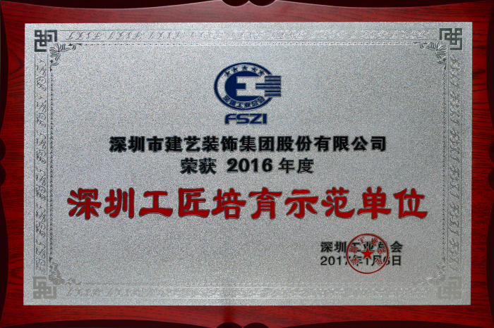 建藝集團(tuán)榮獲的“2016年度深圳工匠培育示范單位”牌匾