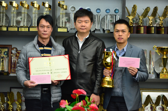 鑒于工程管理中心陳計明、郭勇剛等人在11月深裝協(xié)舉辦的“2016年深圳技能大賽暨首屆深圳市建筑裝飾職業(yè)技能競賽”決賽中憑借一流的表現(xiàn)與優(yōu)秀的團隊配合,斬獲“團體季軍”及“個人三等獎(鑲貼工項目)”,為集團贏得了榮譽,用成績詮釋了建藝人精湛的工匠技藝與嚴謹務實工作作風。1月16日,建藝集團副總裁趙紂瑜代表集團,向陳計明、郭勇剛二人頒發(fā)獎金,以示鼓勵。