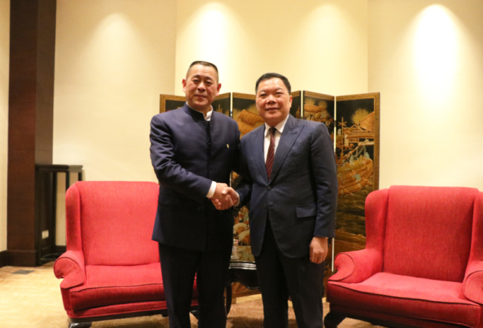 建藝集團董事長兼總裁劉海云(右)與天基權(quán)集團董事長釋延豹合影
