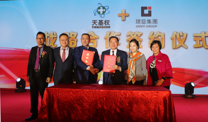 2017年1月21日,在深圳天基權(quán)健康科技集團股份有限公司15周年慶典會上,建藝集團董事長兼總裁劉海云與天基權(quán)集團董事長釋延豹分別代表雙方企業(yè)簽署戰(zhàn)略合作協(xié)議,掀開“建藝”“天基權(quán)”強強聯(lián)合、共贏未來的嶄新篇章。簽約后,建藝集團董事長兼總裁劉海云上臺發(fā)言,表示建藝集團和天基權(quán)集團此次的強強聯(lián)合,一定能讓天基權(quán)借助資本市場的力量為人類健康貢獻更大的力量,同時也為雙方后續(xù)更加深入、全面的戰(zhàn)略合作打下堅實根基,并為建藝集團未來的戰(zhàn)略產(chǎn)業(yè)布局架設(shè)更寬廣的橋梁。建藝集團董事、副總裁顏如珍,建藝集團董事、副總裁孫昀,建藝集團副董事長劉珊等出席周年慶典活動并見證了雙方締結(jié)戰(zhàn)略合作這一重要時刻。