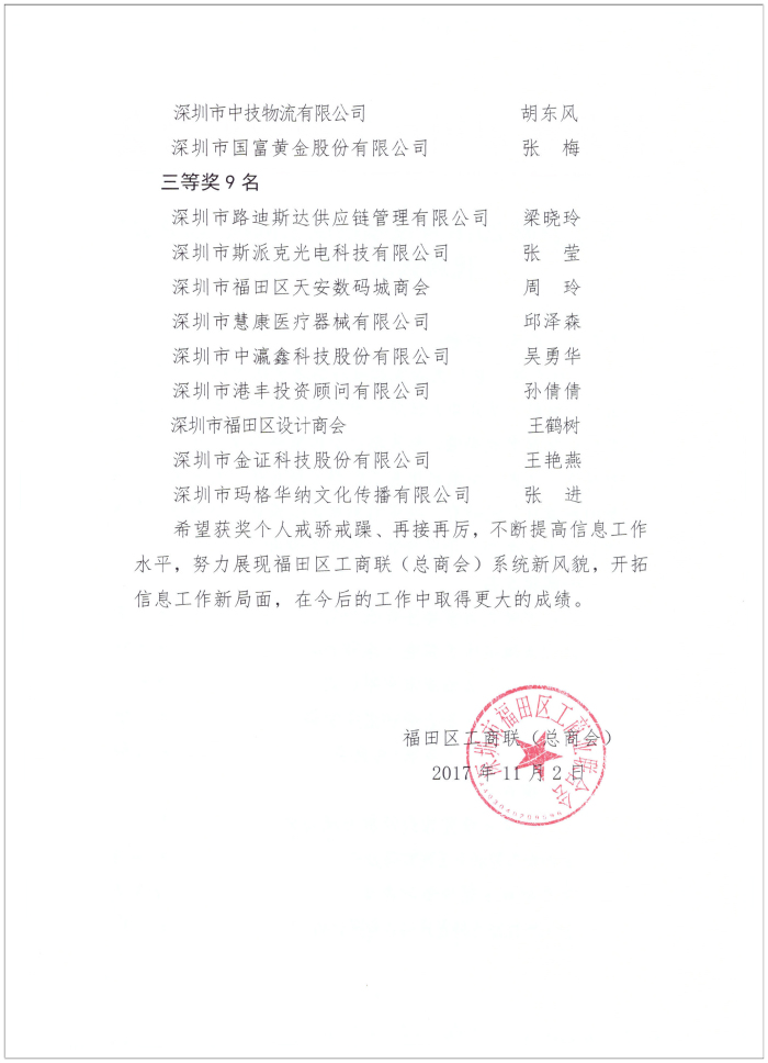 2016年度福田區工商聯(總商會)優秀信息員表彰文件
