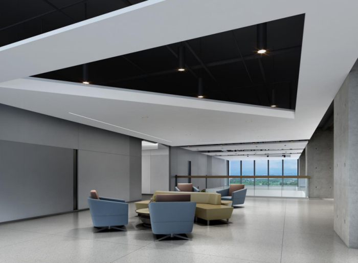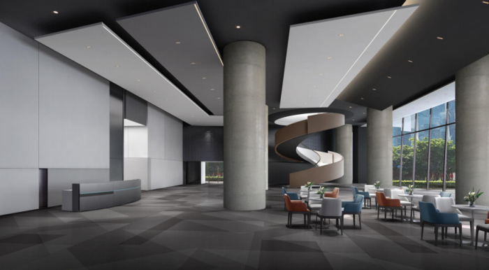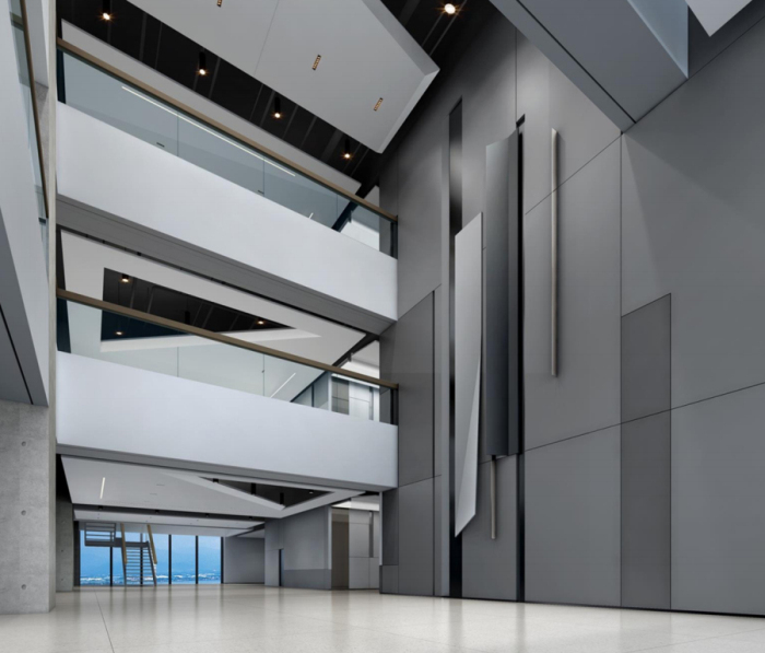 二層大廳:面向通高大廳的核心筒墻面,成為跨越多層的視覺中心。具有抽象浮雕藝術(shù)感的墻面,較好地凸顯了空間的可視性和美學(xué)深度。