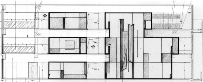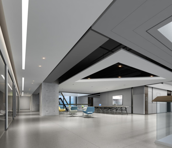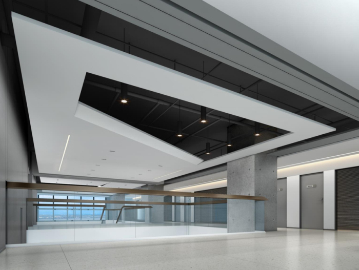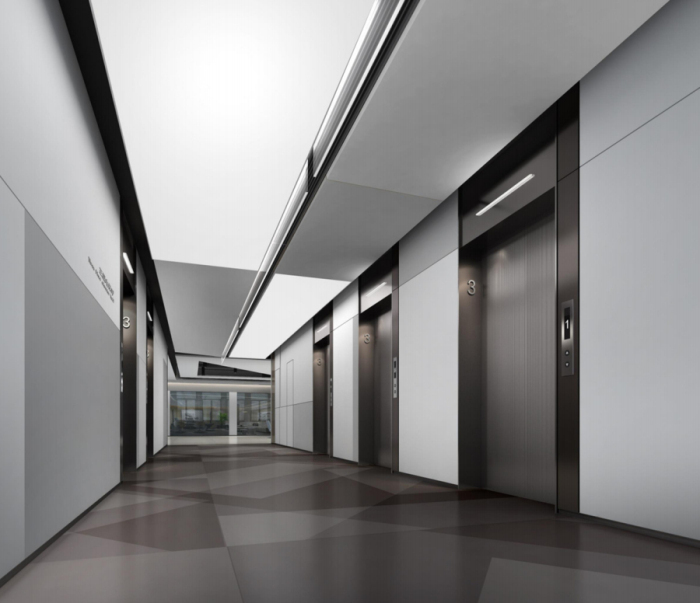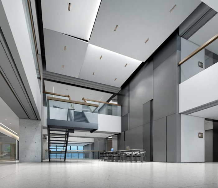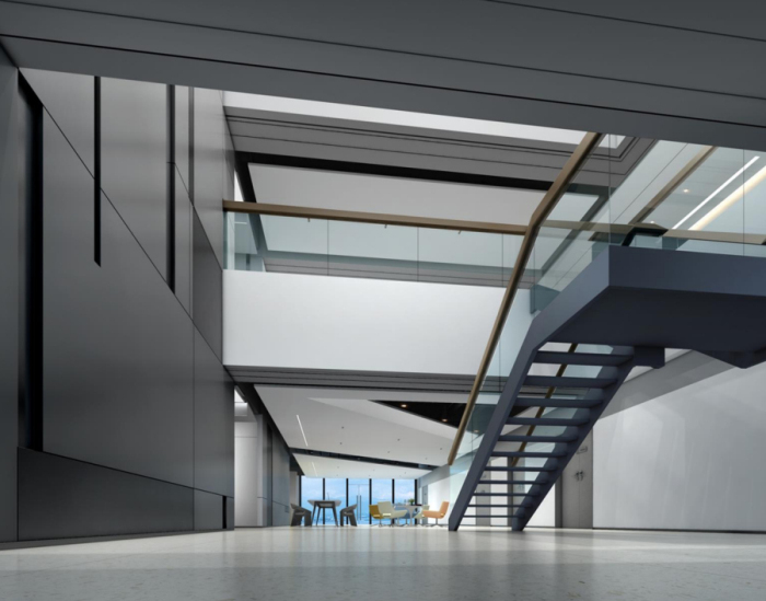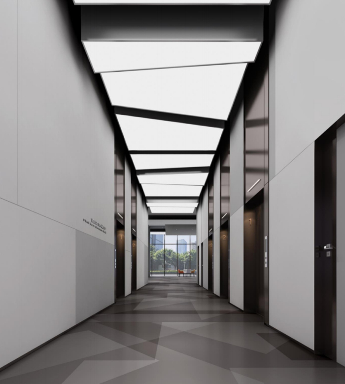 二至四層大廳主立面:中灰度分色墻面,深色凹槽、錯落有致的線條分割,干凈利落、簡約現(xiàn)代,增添了空間的厚實感、設(shè)計感、藝術(shù)感、秩序感、工業(yè)感,嚴謹?shù)脑O(shè)計手法既新穎又現(xiàn)代。