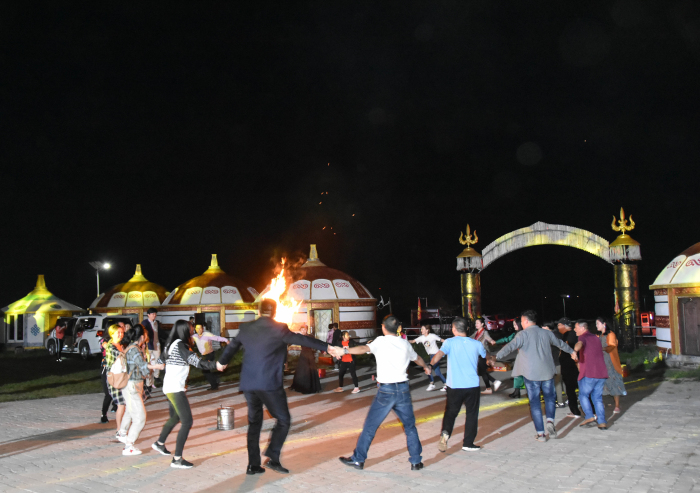 建藝人圍著“紅紅火火”的篝火載歌載舞
