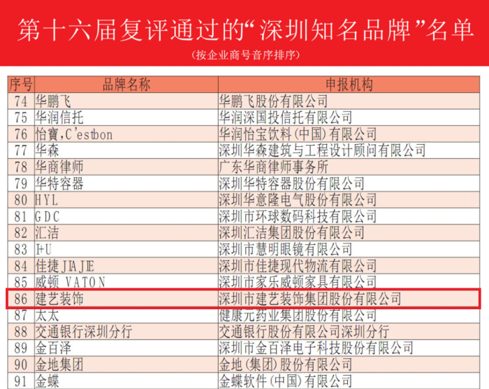 日前,深圳知名品牌評(píng)價(jià)委員會(huì)公布了第十六屆“深圳知名品牌”復(fù)審?fù)ㄟ^(guò)企業(yè)名單,剛剛獲評(píng)為“深圳老字號(hào)”的建藝集團(tuán),其所持有的“建藝裝飾”品牌順利通過(guò)復(fù)審,第五次榮膺“深圳知名品牌”稱(chēng)號(hào)。