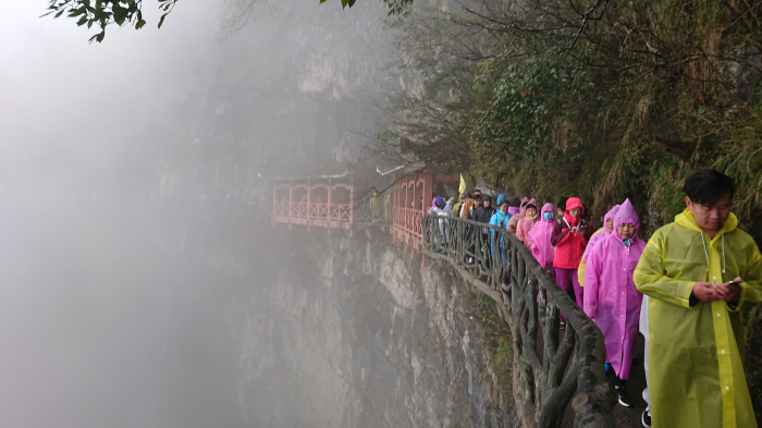 四月的天,喜怒無常,讓人琢磨不透。登天門山前往玻璃棧道與鬼谷棧道的過程中,山上風雨交加,云霧蒙蒙。整個天門山系就猶如含羞的少女,猶抱琵琶半遮面,隱藏在煙雨中。而此時此刻的天門山頂景區,也宛如仙境一般迷人。置身于云霧中的建藝人,穿著五顏六色的雨衣,在云雨中彼此攜手結伴,奮勇前進,成為了景區的一道“獨特風景線”。