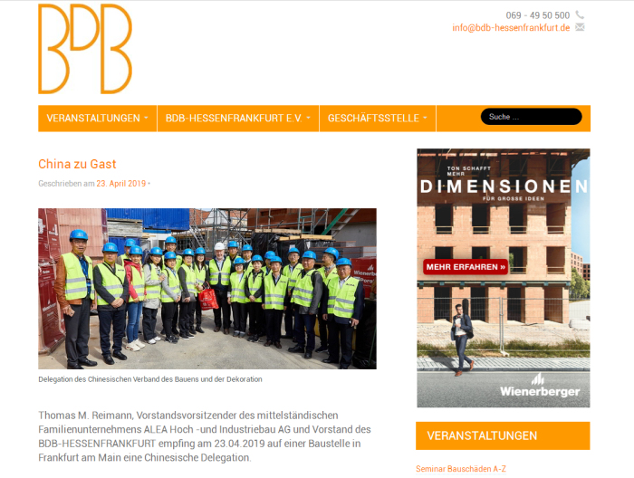 參觀交流活動結(jié)束后,德國聯(lián)邦建筑及建筑工程師協(xié)會——黑森州分會(BDB)在其官網(wǎng)bdb-hessenfrankfurt.de上對本次交流活動進(jìn)行了專門報(bào)道。