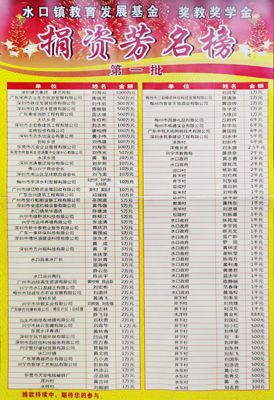 昨日,是第36個教師節(jié)。作為“廣東省教育強鎮(zhèn)”,興寧市水口鎮(zhèn)特別發(fā)布“表彰芳名榜”,向在2020年教育發(fā)展基金啟動中慷慨捐贈(認(rèn)捐)善款的廣大愛心鄉(xiāng)賢人士致謝。建藝集團、建藝控股董事會主席劉海云以身作則,首批響應(yīng)家鄉(xiāng)號召,帶頭認(rèn)捐1000萬元善款!這也是自2017年捐助水口中學(xué)教育強市200萬元后,劉海云又一次為家鄉(xiāng)教育事業(yè)發(fā)展傾注愛心。
