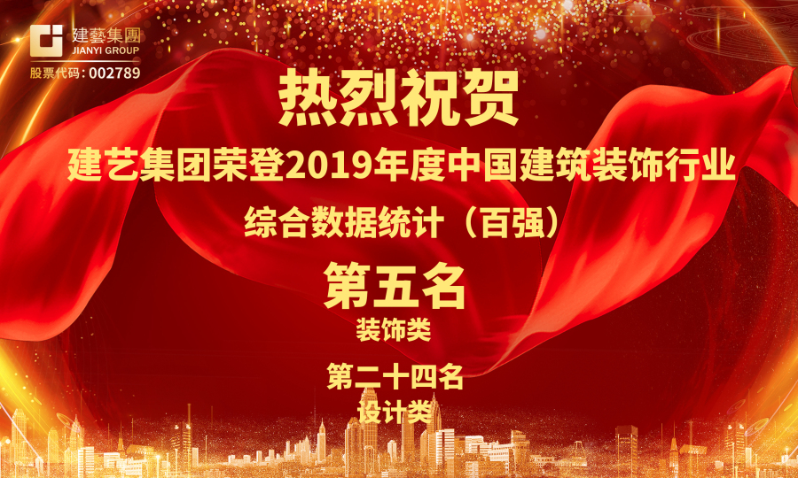 當(dāng)日上午,在備受業(yè)界矚目的“2019年度中國建筑裝飾行業(yè)綜合數(shù)據(jù)統(tǒng)計結(jié)果發(fā)布會”上,建藝集團(tuán)憑借穩(wěn)健的綜合實力,榮登“2019年度中國建筑裝飾行業(yè)綜合數(shù)據(jù)統(tǒng)計”榜單(裝飾類)第五名、(設(shè)計類)第二十四名。這是自2011年度以來,第八次躋身中國建筑裝飾行業(yè)百強前十名,更是自2004年度以來,連續(xù)第十五次進(jìn)入中國建筑裝飾行業(yè)百強前二十名。