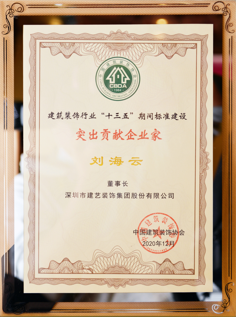 建藝集團(tuán)董事會主席劉海云獲評為“建筑裝飾行業(yè)‘十三五’期間標(biāo)準(zhǔn)建設(shè)突出貢獻(xiàn)企業(yè)家”