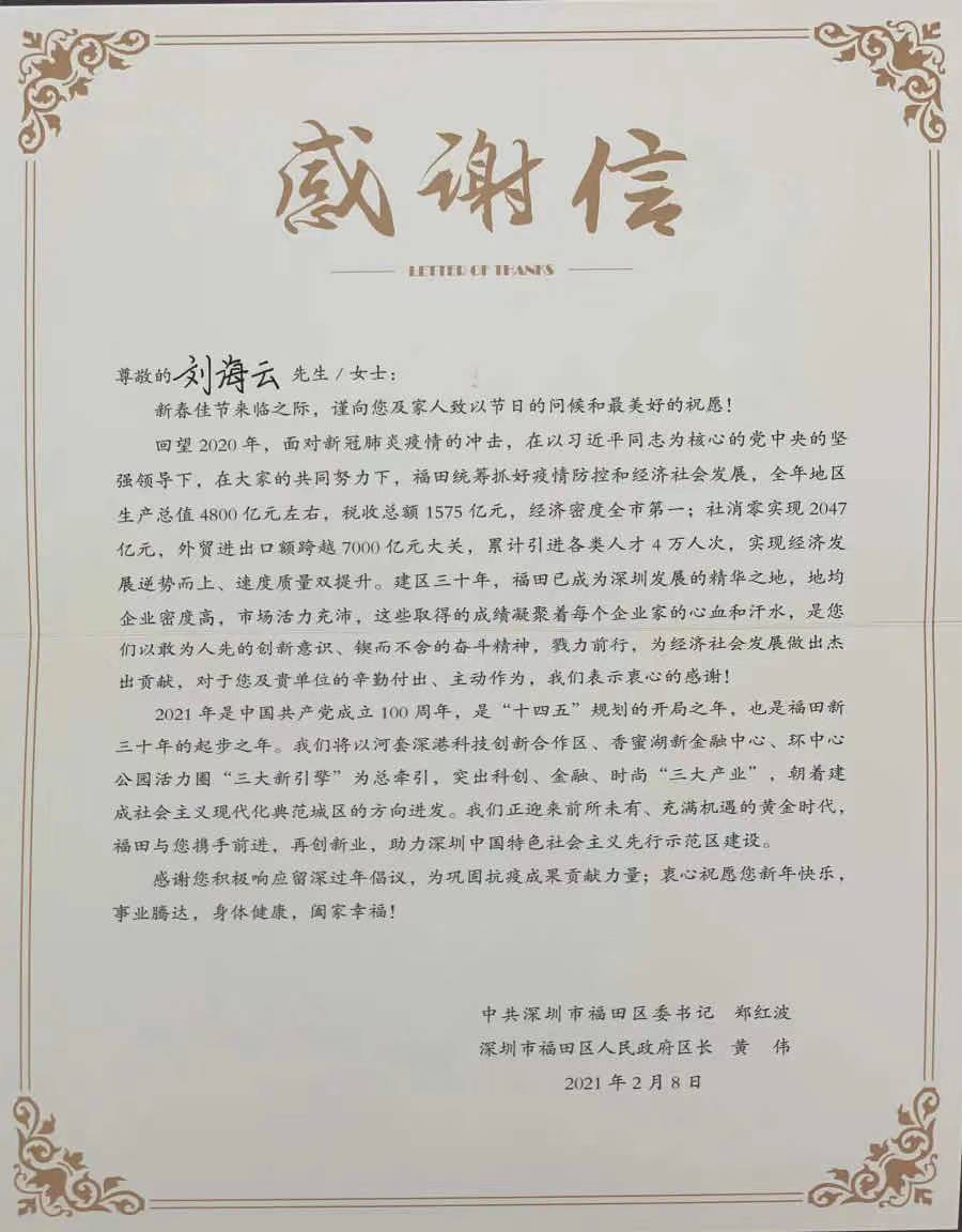多年來,市、區各級領導也多次關心、關懷建藝集團的發展。從疫情防控到企業經營,來自轄區各級單位、組織的關懷無處不在、無微不至。“深耕福田,攜手共進”,在農歷春節到來之際能夠收到轄區的問候與關愛,這對建藝而言是莫大的鼓舞與動力。未來,全體建藝人定將與福田攜手前行,再創佳績,共同努力,助力深圳建設中國特色社會主義先行示范區。