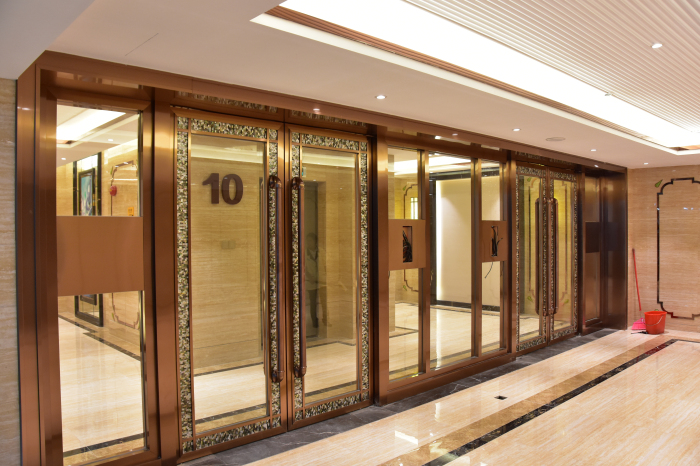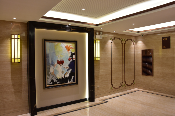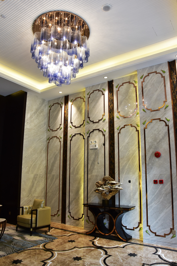 即便是地下入戶大堂和標準層電梯廳,設計上也極其講究,力求與首層大堂設計相呼應。地下入戶大堂墻地面全部采用仿大理石瓷磚,墻面同樣鑲嵌玫瑰金鏡面不銹鋼裝飾條配以藍寶石點綴,地面采用淺啡網及阿富漢黑金花瓷磚波打線,視覺效果強烈,線條感十足。標準層電梯廳墻面為大理石瓷磚搭配玫瑰金不銹鋼腰線,地面為大理石瓷磚拼花,天花則采用金箔飾面做舊工藝,整體交相輝映、不失尊貴。