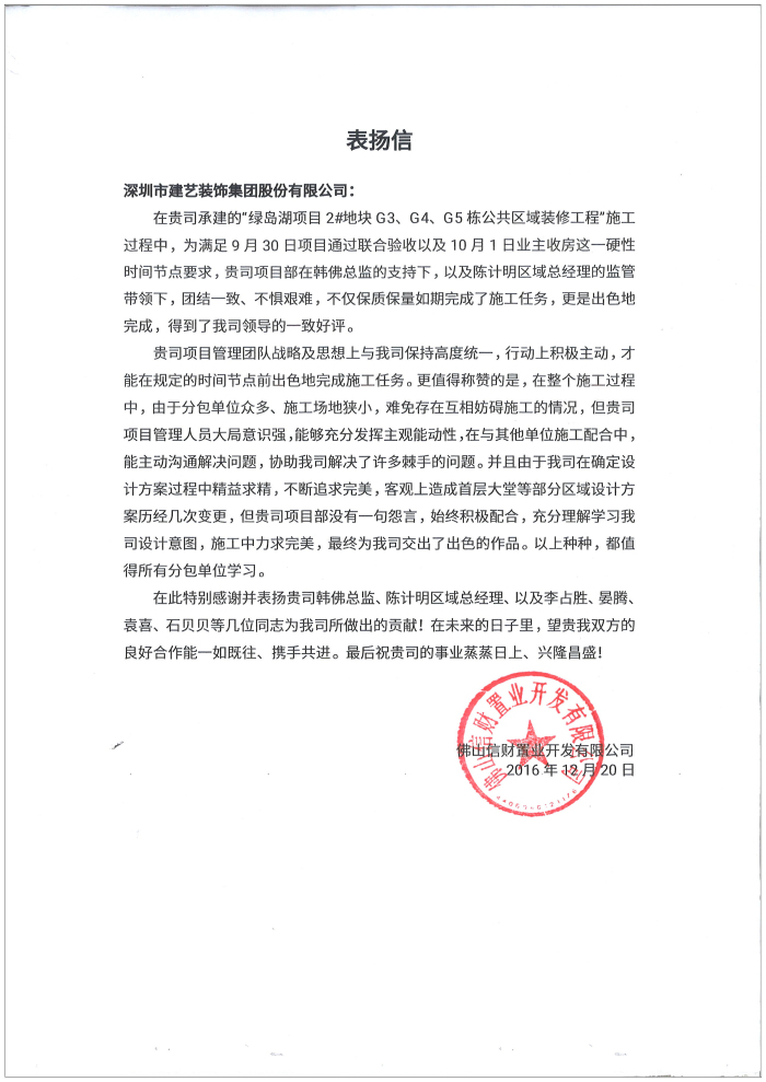 建藝集團佛山綠島湖項目管理團隊受甲方高度好評