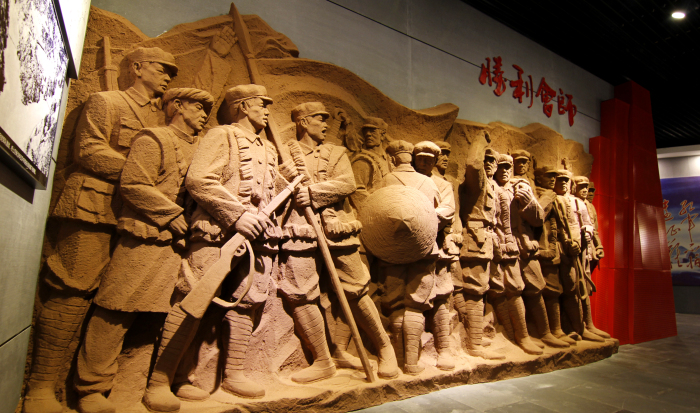 紅軍過(guò)雪山的立體墻面,近處幾個(gè)紅軍戰(zhàn)士正在行軍中,仿佛要走出來(lái)一般,顯得非常逼真,栩栩如生;遠(yuǎn)處則是大部隊(duì)人馬正在翻越雪山的情景。