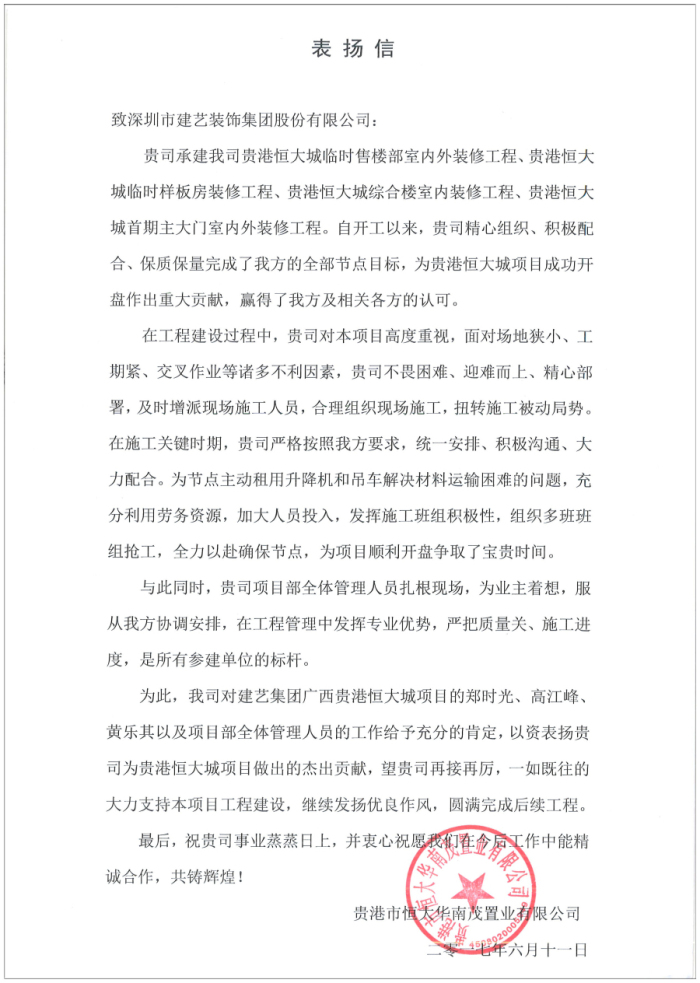 此次廣西貴港恒大城項目的正式開盤,實現了建藝集團對業主方的承諾,再一次用成績凸顯了建藝集團的品牌信譽度與雄厚實力,為建藝集團工程榮譽簿再增新輝!
