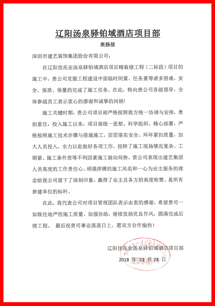 近日,由建藝集團承建的遼陽佳兆業湯泉驛鉑域酒店項目精裝修工程順利交付。