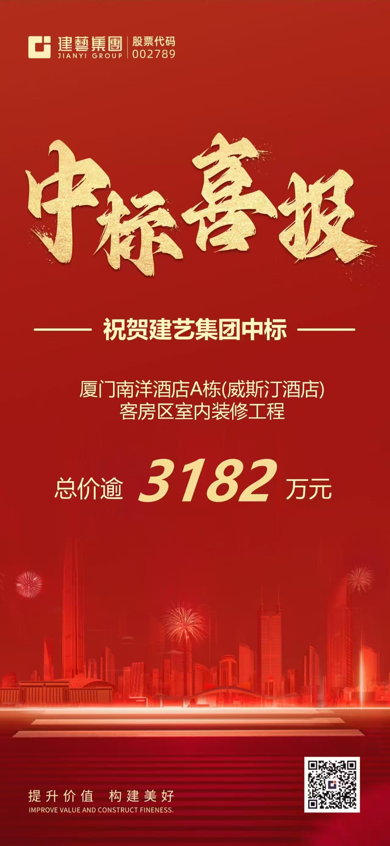 近期,深圳市建藝裝飾集團股份有限公司新晉中標福建省廈門市“廈門南洋酒店A棟(威斯汀酒店)客房區室內裝修工程”,總價逾3182萬元。