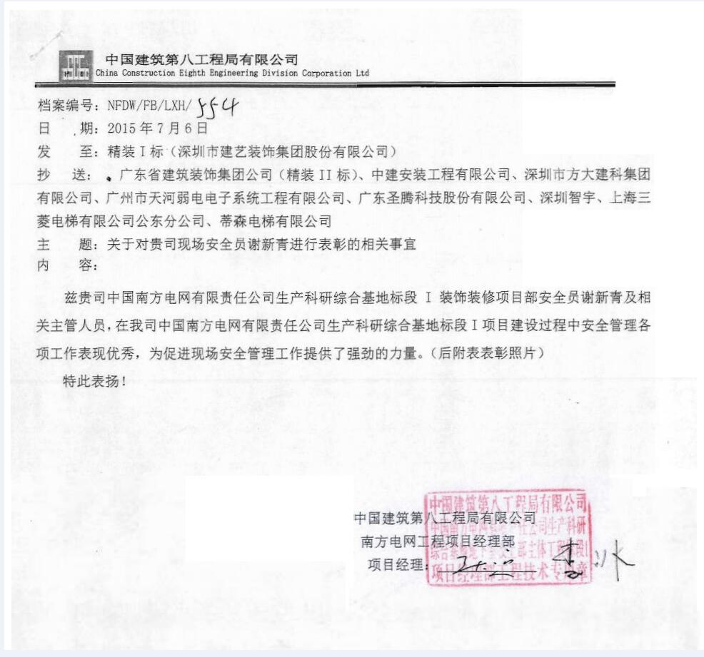 建藝集團安全員謝新青獲中建八局南方電網項目部通報表彰