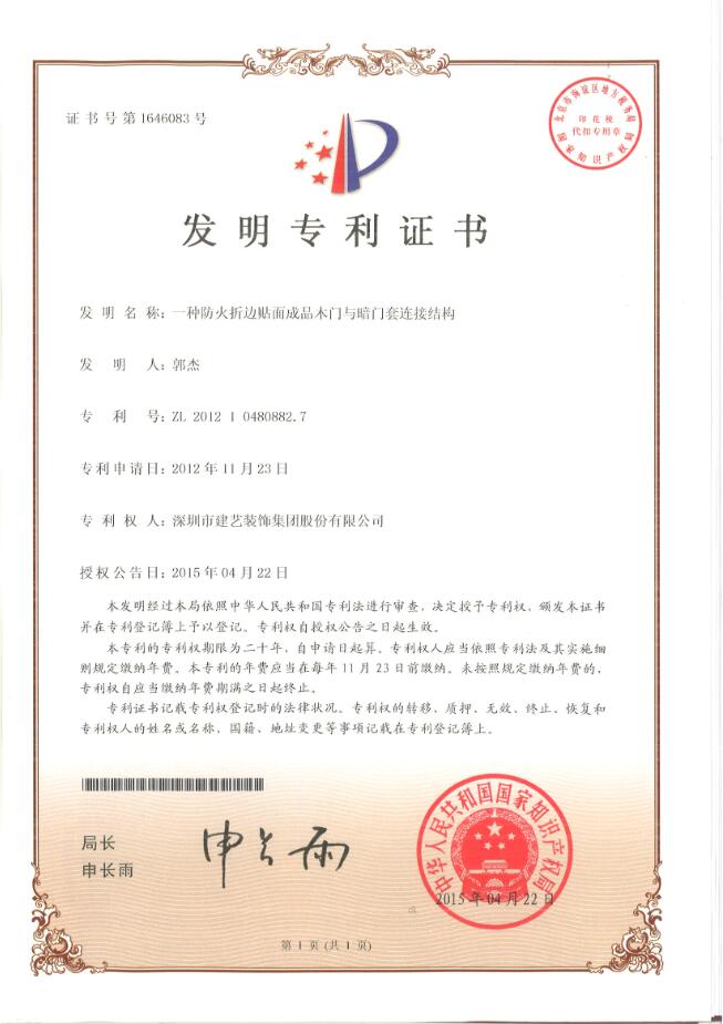 建藝集團“一種防火折邊貼面成品木門與暗門套連接結構”發明專利證書
