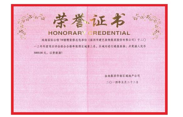 日前,珠海國際公館7#樓精裝修總包單位——深圳市建藝裝飾集團股份有限公司,憑借一流的施工品質,獲得了金地集團2013年度項目評估綜合合格率區域第三的好成績。金地集團華南區域地產公司在區域內對建藝集團進行了通報表彰,并頒發3000元獎金以資鼓勵。
