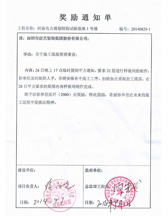 業主方在對樣板間進行查看時,在現場就肯定了我司項目部的施工組織和施工管理,令項目部人員倍感欣慰。出人意料的是,現場指揮部和現場監理部更是在后期送來了書面獎勵通知單,并給予項目部貳仟元的現金獎勵,使我項目部人員大受鼓舞。我司項目部員工在接到獎勵通知后,紛紛表示以后將以更飽滿的工作熱情、更努力的工作態度,做好本項目的后續施工,延續建藝集團一貫的高效、優質施工作風。