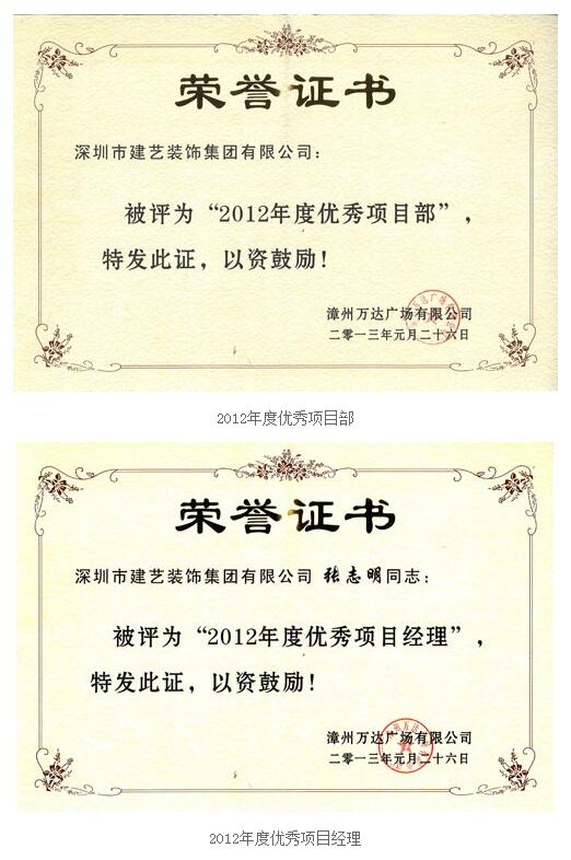 建藝集團漳州萬達項目部于2013年元月被建設單位——漳州萬達廣場有限公司評為“2012年度優秀項目部”,表彰我司在漳州萬達廣場項目的建設過程中,積極配合各方,精心施工,科學管理,嚴把質量關,滿足了業主要求的各項時間節點,圓滿地完成了施工任務,受到各方單位的高度表揚及充分肯定。