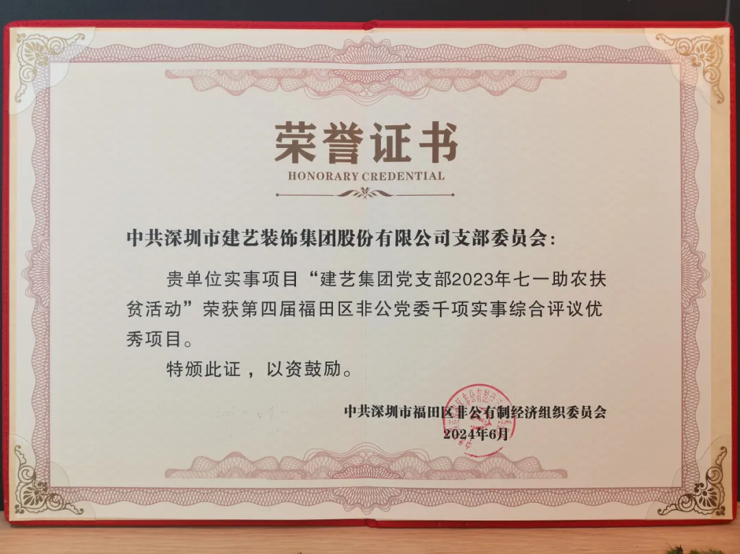 深圳市建藝裝飾集團(tuán)股份有限公司黨支部(下稱(chēng)建藝集團(tuán)黨支部)受邀出席此次大會(huì),憑借“2023年七一助農(nóng)扶貧活動(dòng)”實(shí)事項(xiàng)目在數(shù)十家非公黨組織中脫穎而出,被評(píng)為第四屆福田區(qū)非公黨委“千項(xiàng)實(shí)事”綜合評(píng)議優(yōu)秀項(xiàng)目!