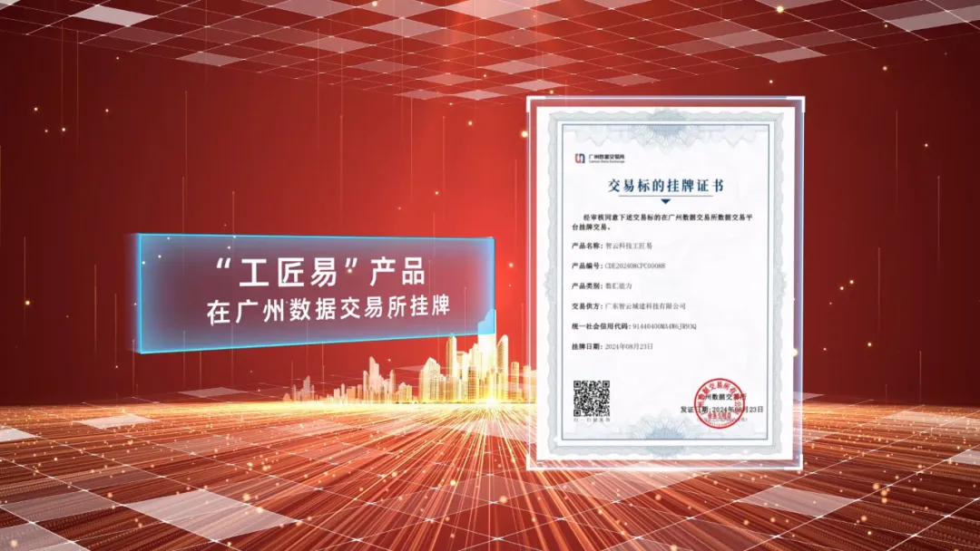 近日,建藝集團旗下孫公司——廣東智云城建科技有限公司(原名廣東建采網科技有限公司,下稱智云城建科技)其自主研發的產品“工匠易”,在廣州數據交易所成功掛牌,標志著該產品正式進入數據交易市場,獲得交易標的掛牌證書,成為推動建筑行業數字化轉型的重要力量。